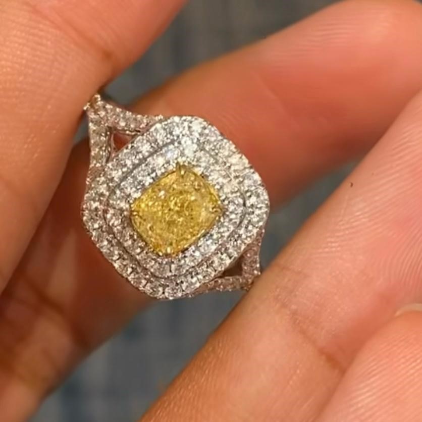 a 1.01ct GIA-certified Natural Light Yellow cushion diamond (Y–Z, VS1) Set in 5.414gms of gold, ring