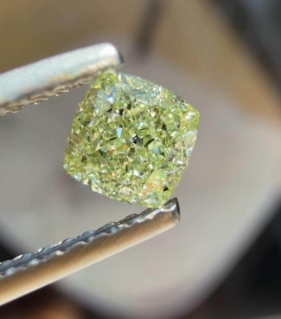 0.56ct GIA Certified Natural Fancy Yellow Green VVS2 Clarity Cushion Cut Diamond.