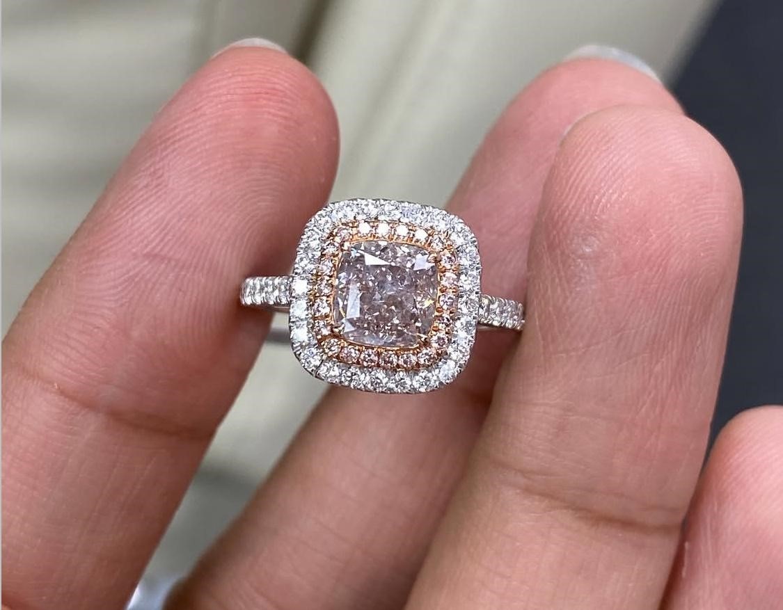 1.38ct GIA Certified Natural Fancy Brownish Pink VS2 Clarity Cushion Set In Double Halo Ring With pink & White Diamonds around