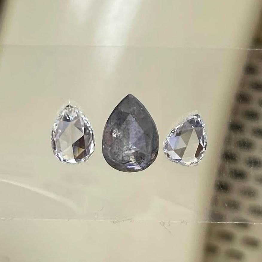 2.37ct layout is such an artistic mix is a striking salt and pepper diamond of 1.46cts in the center, paired beautifully with two contrasting pear rosecuts, one 0.52ct in I color SI1 clarity and the other 0.39ct in H color VS2 clarity.
