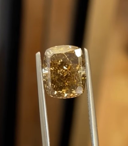 3.52cts natural dark brown VS1 clarity cushion shape diamond with a rich, intense color that instantly pulls you in.