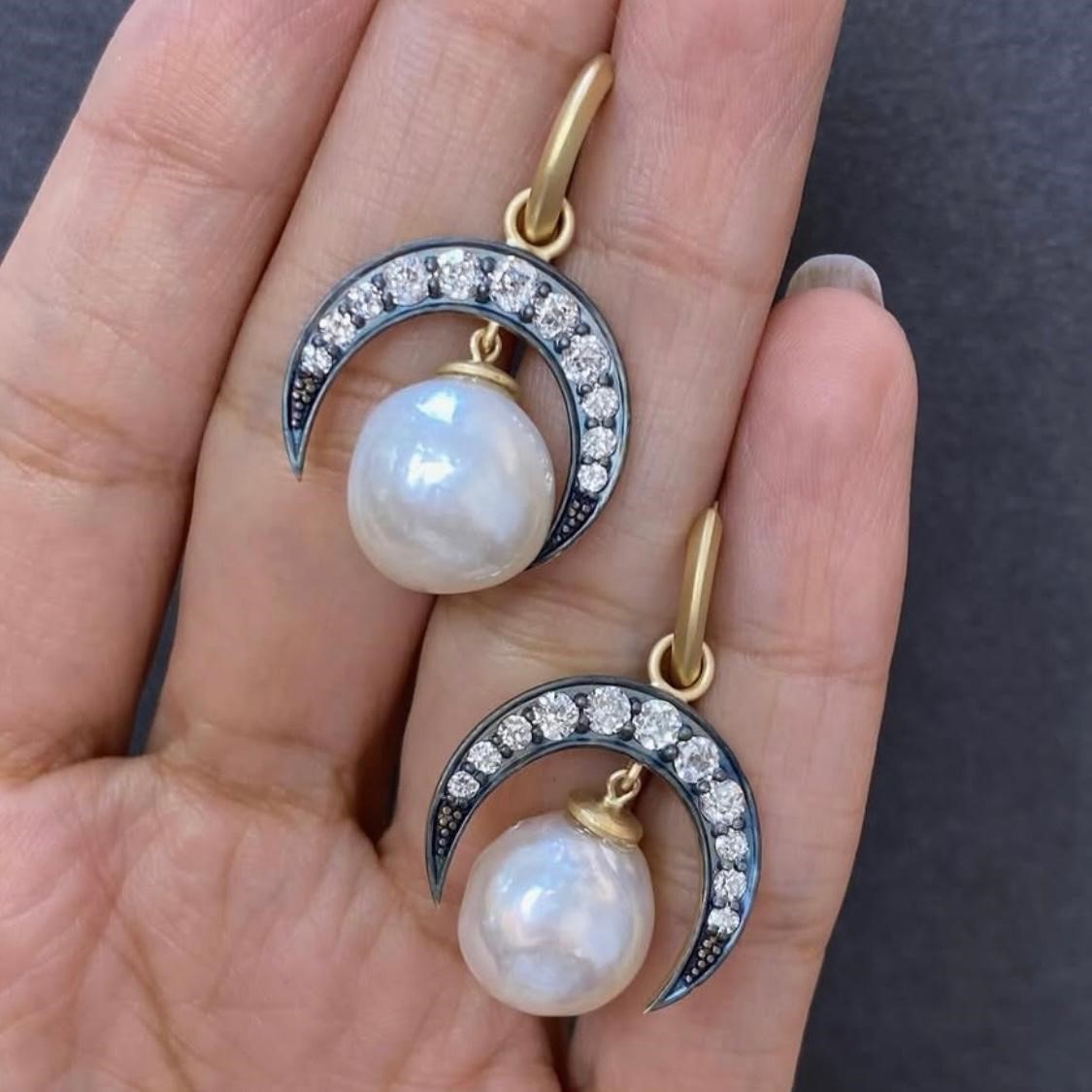 A pair of 18k gold earrings Set with 22 old cut white diamonds totaling 1.31ct with the organic glow of two baroque pearls weighing 25.27ct in total.