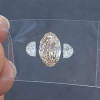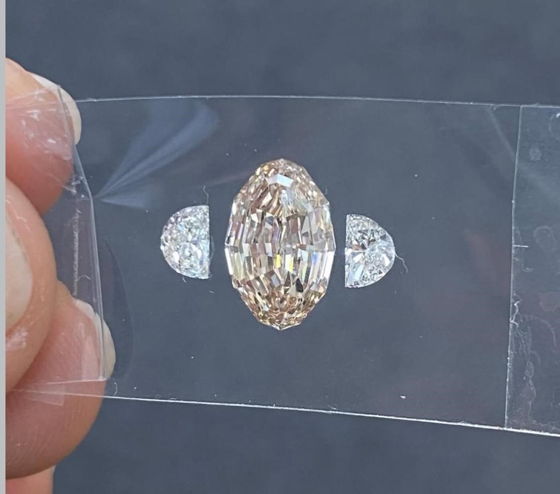 At the centre sits a 2.13ct peachy brown VS1 step cut oval, glowing with warm depth and crisp lines. Framing it are two icy G color VVS2 half moon diamonds,