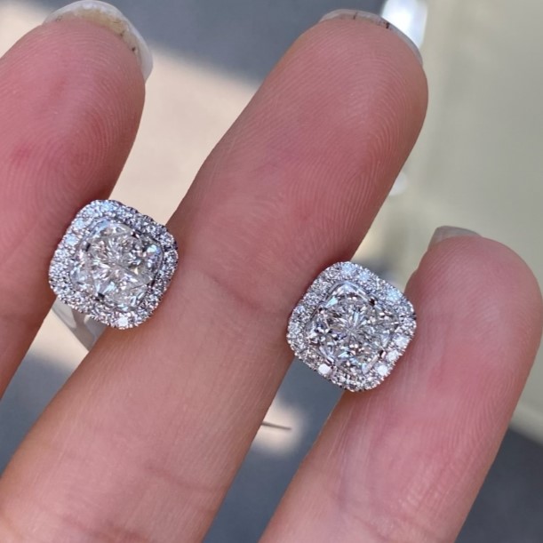 Illusion Cut Natural White Diamond Cushion Shape Earings With White Diamond Halo in 18k White Gold. <div class="table-responsive"> <table class="table" style="width: 100%;"> <tbody> <tr> <td>Total diamond cts</td> <td>Center : 0.71ct<br /> Side halo diamonds: 0.26cts</td> </tr> <tr> <td>Total diamond pcs</td> <td>Center : 8pcs <br /> Side halo diamonds: 40pcs</td> </tr> <tr> <td>Gold weight</td> <td>3.22gms</td> </tr> <tr> <td>Gold type</td> <td>18k</td> </tr> <tr> <td> </td> <td> </td> </tr> </tbody> </table> </div>