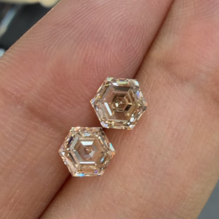 Natural matching pair of natural peachy brown VS Clarity step cut Hexagon Shape diamonds