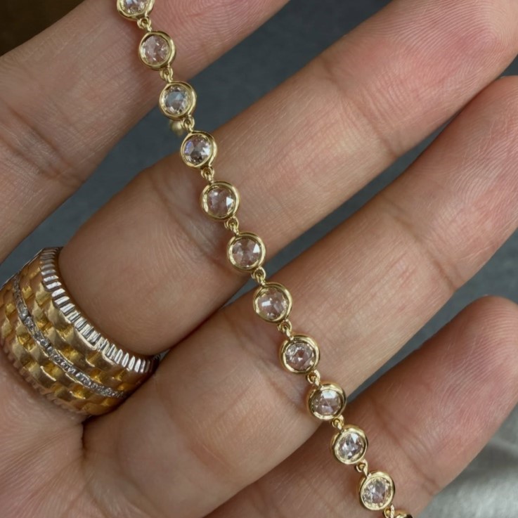 Natural White Rosecut Round Diamond Tennis Bracelet In 18k Yellow Gold Bezel Setting