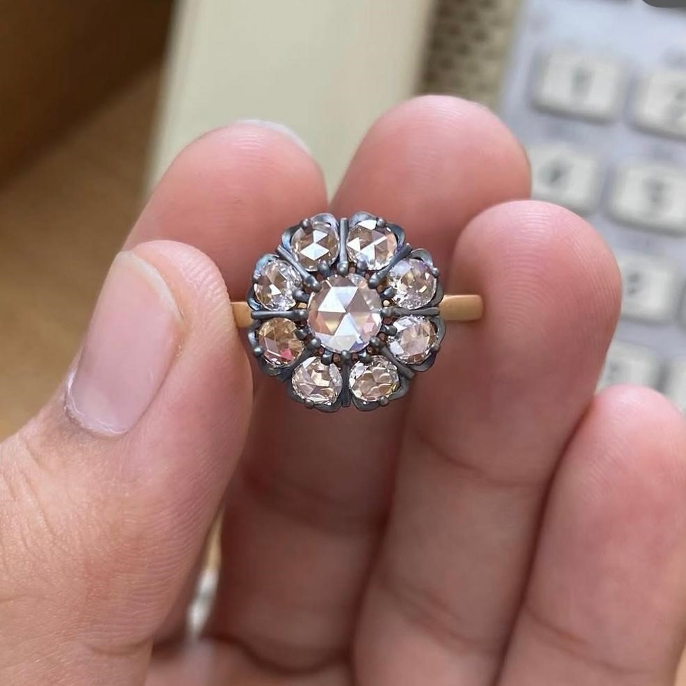 vintage-inspired ring, crafted with white rose cut diamonds arranged in a soft floral pattern