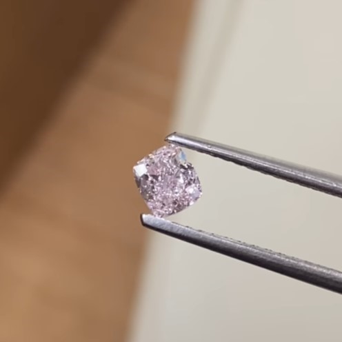 A 0.43ct GIA certified natural fancy light pink cushion with SI2 clarity,