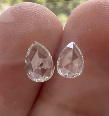A 0.91cts total weight pair of natural HI color VS2 clarity rosecut pear shape diamonds