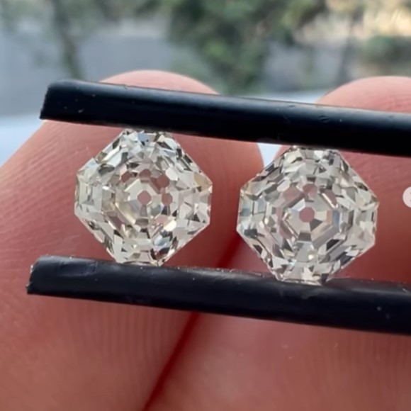 A 1ct GIA certified natural L color (faint brown) VVS2 clarity Asscher cut diamond paired with a 1ct natural L color VS1 clarity Asscher cut diamond