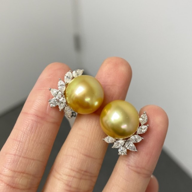 Beautiful South Sea Elegant Pearls set with White diamonds set in 18 K Gold Earrings