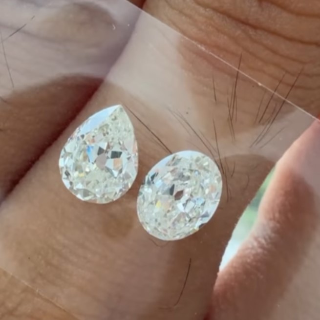 The 0.63cts J color oval old cut brings softness and calm, while the 0.76ct K color pear old cut both with SI1 clarity